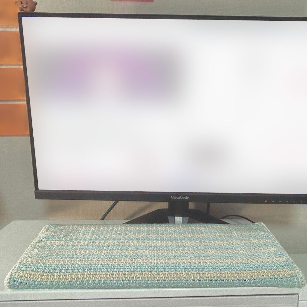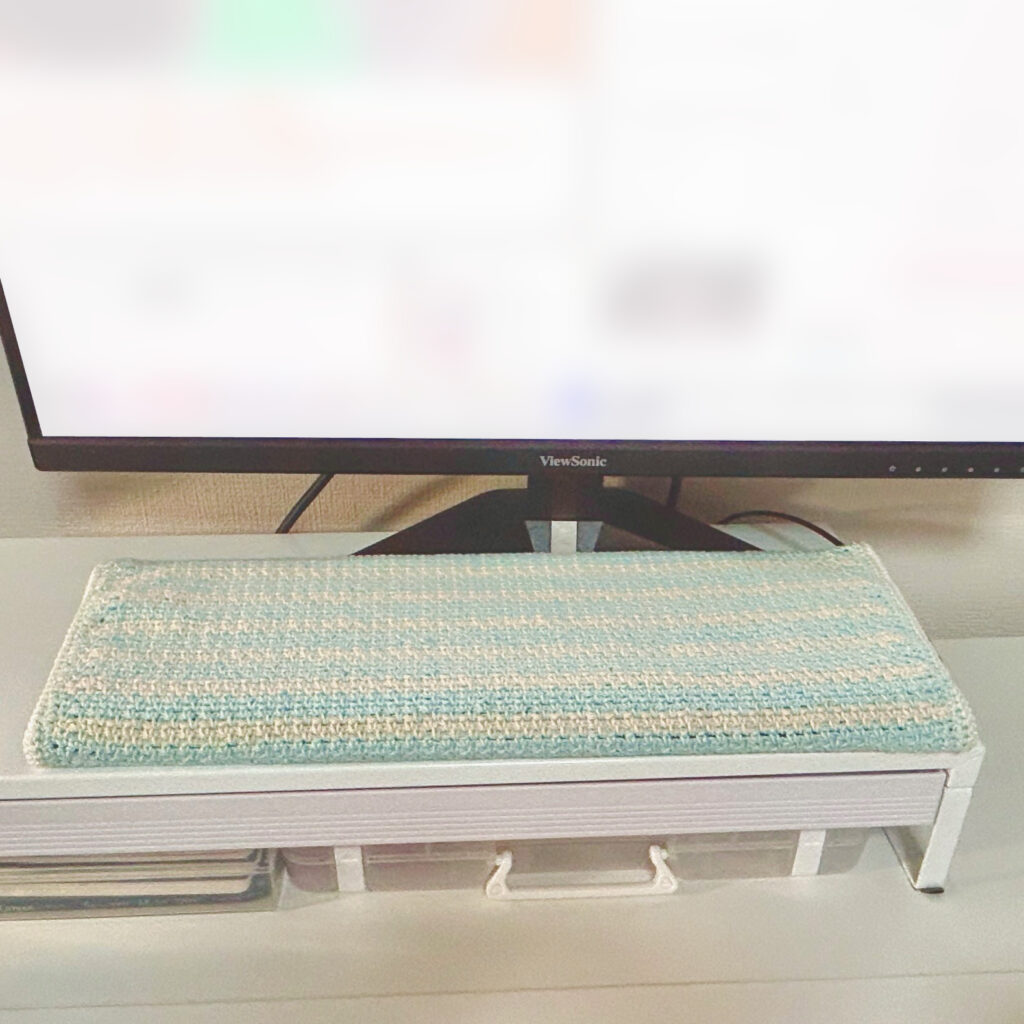 後、『どうせキーボードの下に敷く部分とキーボードの陰(奥)になる部分だし……』という甘えから、若干編み方が甘くなっておりますが、そこはご愛敬で(笑)
